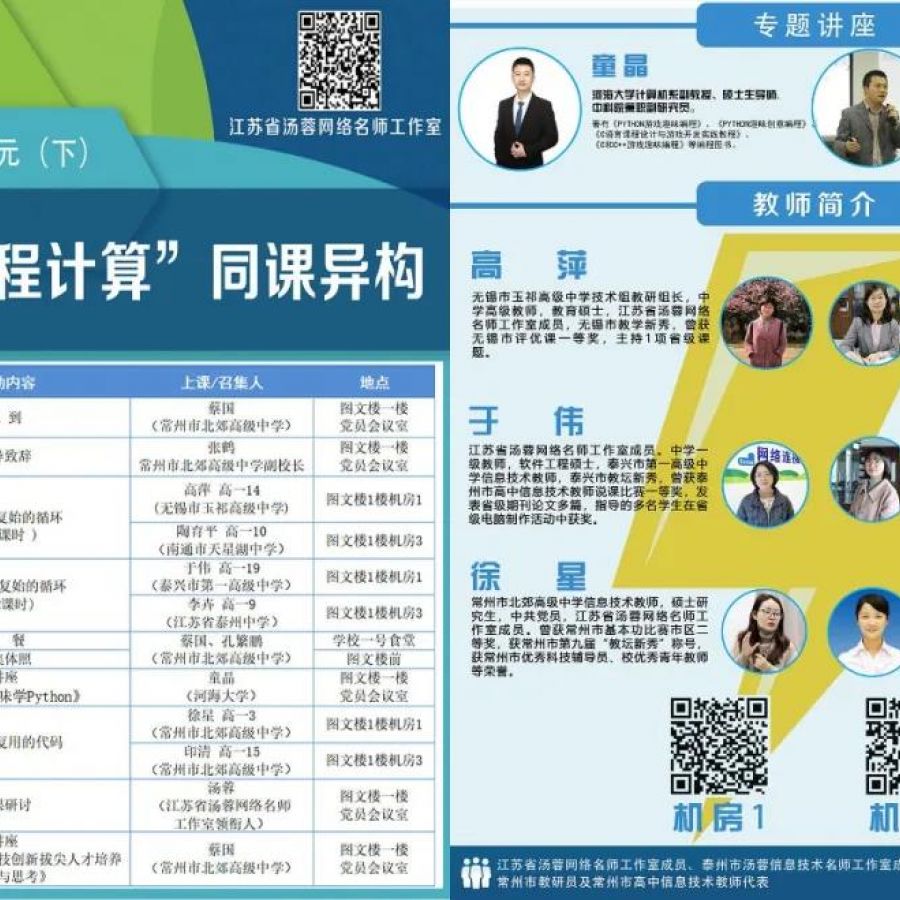本次研討活動共有開幕儀式、課堂觀摩、評課研討、專家講座四個環(huán)節(jié)。開幕儀式簡樸而正式,主要由主持人蔡國老師簡明扼要地介紹了本次活動的流程及相關(guān)注意事項。在課堂觀摩環(huán)節(jié),來自無錫市玉祁高級中學(xué)的高萍老師、南通市天星湖中學(xué)的陶育平老師、泰興市第一高級中學(xué)的于偉老師和江蘇省泰州中學(xué)的李卉老師針對《周而復(fù)始的循環(huán)》一課進行了同課異構(gòu)。來自常州市北郊高級中學(xué)的徐星和印清老師對《可以復(fù)用的代碼》一課進行了同課異構(gòu)。這六位教師都是江蘇省湯蓉網(wǎng)絡(luò)名師工作室的成員。課堂觀摩結(jié)束后,在工作室領(lǐng)銜人湯蓉老師的主持下,與會專家和教師直奔主題,針對六堂觀摩課各抒己見,進行了熱烈討論。此次活動還邀請了河海大學(xué)童晶副教授和北郊高中蔡國老師分別作了《零基礎(chǔ)趣味學(xué)Python》《關(guān)于普通高中科技創(chuàng)新拔尖人才培養(yǎng)的實踐與思考》的專題講座。
