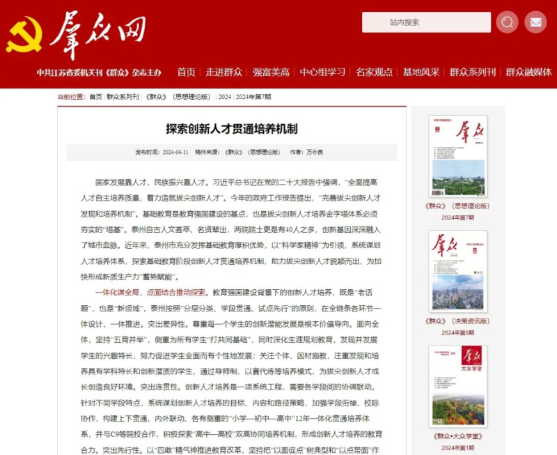 4月11日,《群眾》刊發(fā)題為《探索創(chuàng)新人才貫通培養(yǎng)機(jī)制》的文章,聚焦我市“拔尖創(chuàng)新人才培養(yǎng)”工作。文章全文如下: